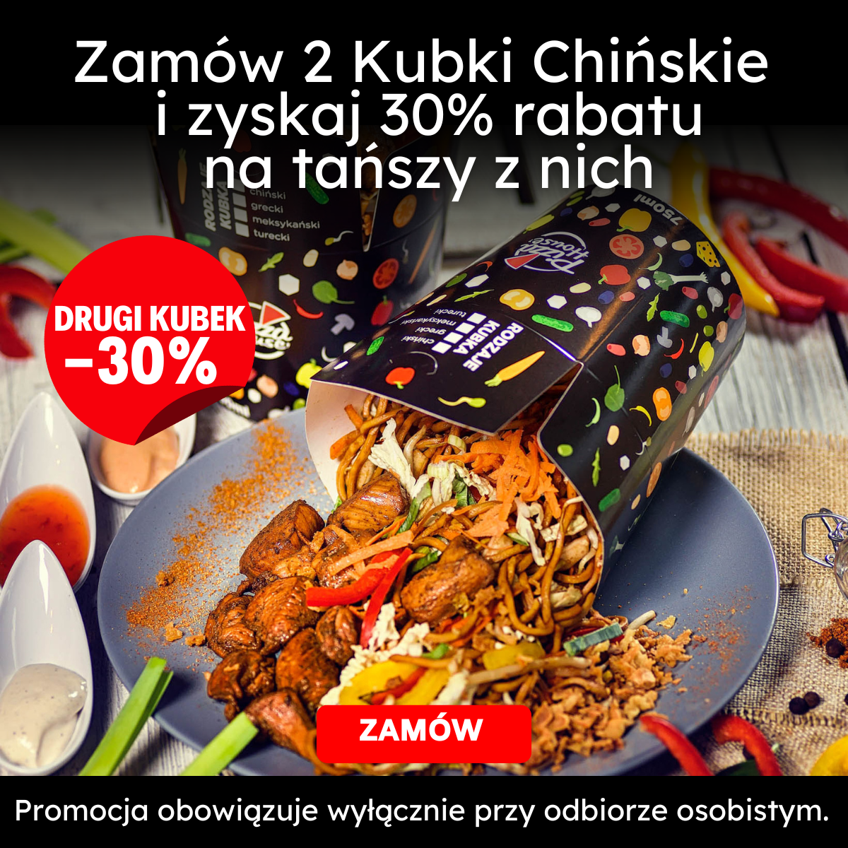makaron, kawałki piersi z kurczaka, kiełki fasoli mung, kapusta pekińska, por, papryka świeża, marchew, cebula prażona, sos
