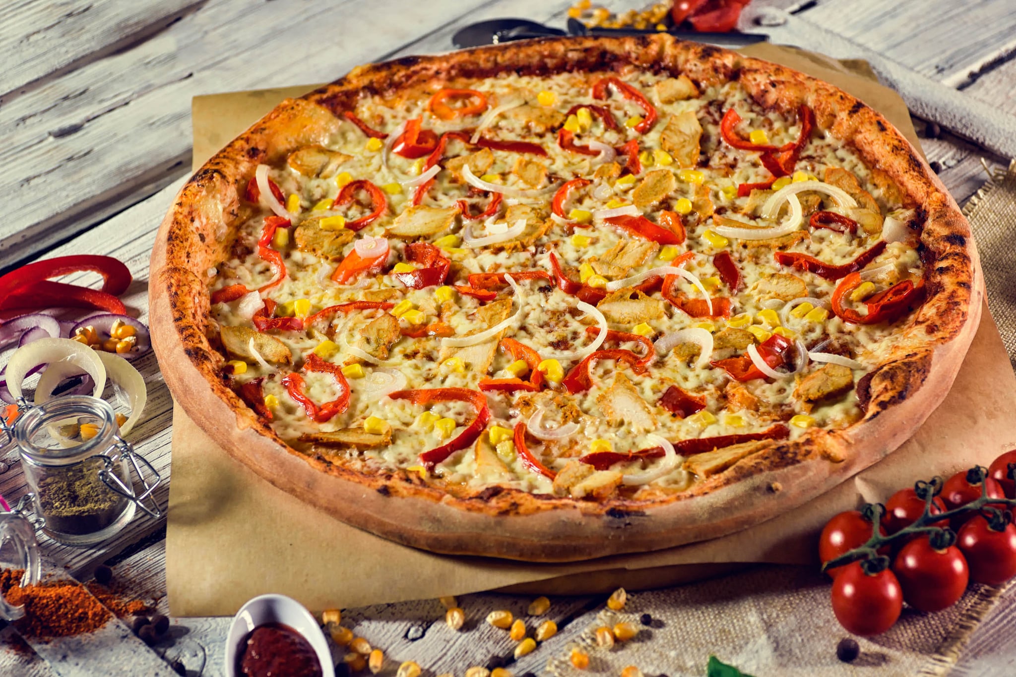 Ser,ziołowy sos pomidorowy,kurczak gyros,kukurydza,papryka,cebula